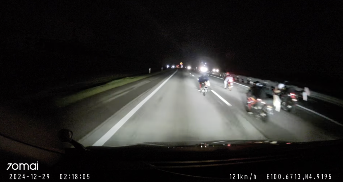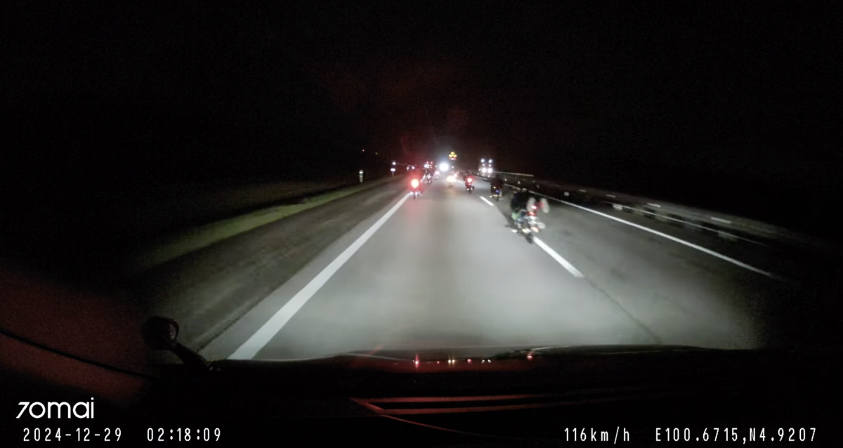 根据网民在脸书群组“DashCam Owners Malaysia”分享的行车记录仪画面显示,至少9名骑士深夜在公路上以惊人的速度竞速。