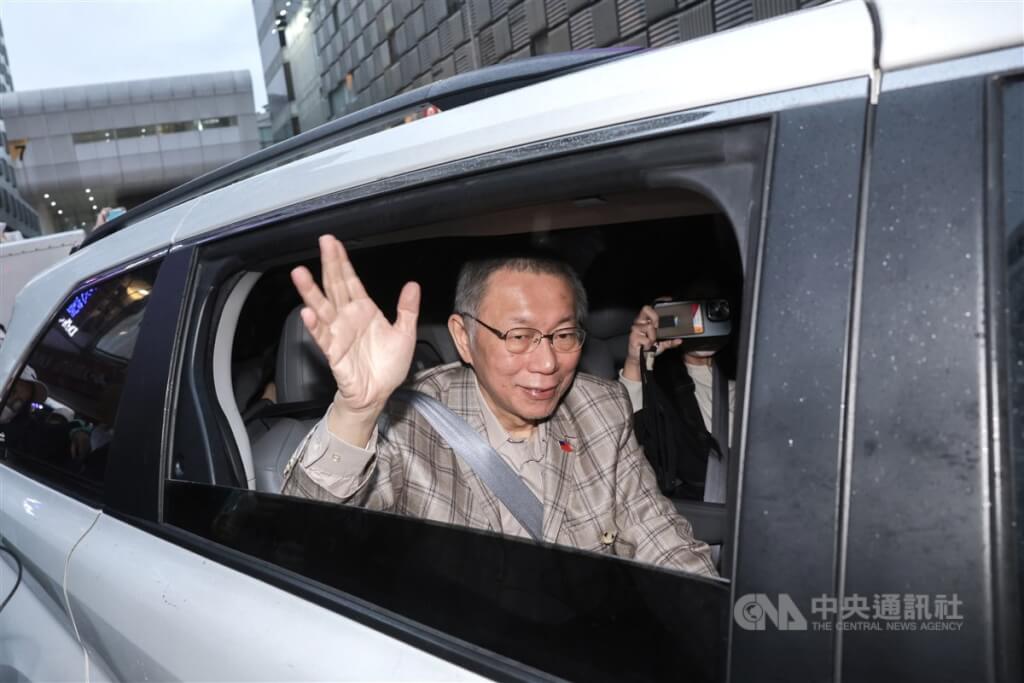 图为柯文折周三在民众党扩大中委会议中辞去党主席职务后,傍晚时分搭车离开党部向在外等候的支持者挥手。