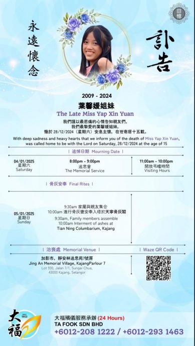 (八打灵再也3日讯)15岁少女叶馨媛的家人将在明天及后天,在加影静安林追思苑为馨媛设灵,并在明晚举行追思会,悼念馨媛。