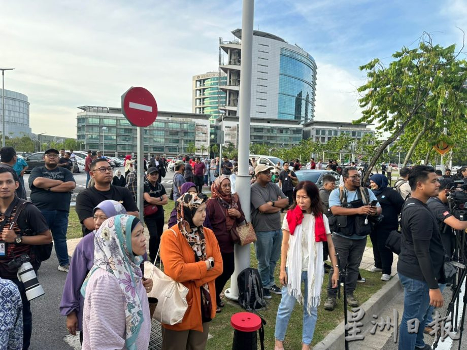 媒体和集会者等待载纳吉的车抵达司法宫。