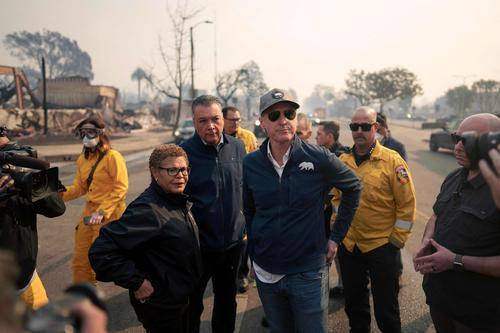 巴斯(前排左)和加州州长纽瑟姆(前排右)周三联袂到访灾区了解救灾进展。(法新社照片)