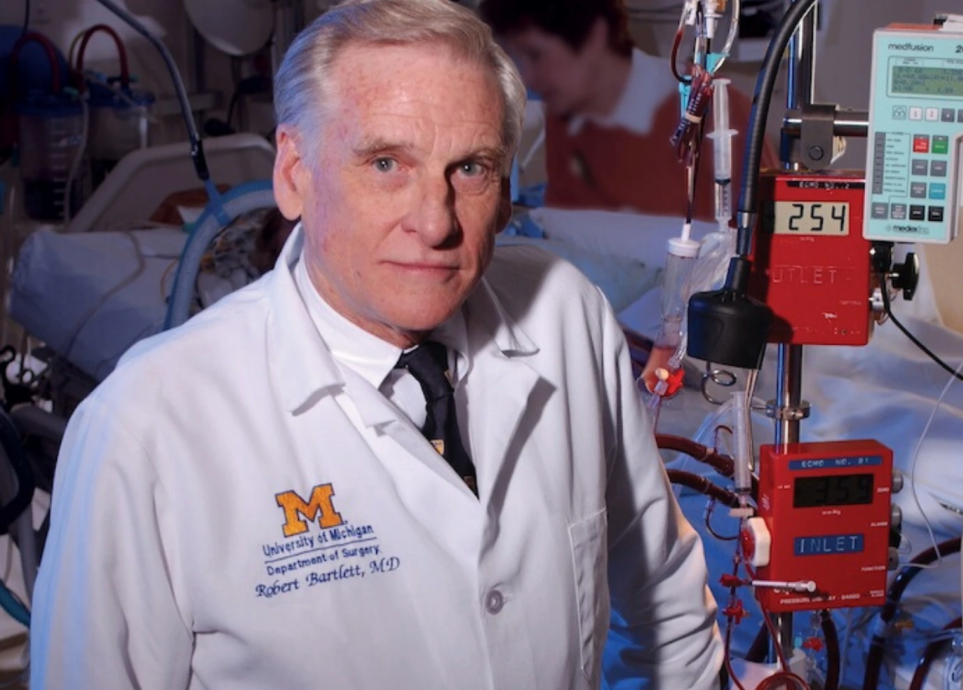 巴列特研发的“叶克膜”机,由体外管路、模拟心脏功能的帮浦以及模拟人工肺的膜片组成,能持续将患者血液泵出体外、添加氧气、去除二氧化碳与加温后,再输回体内。