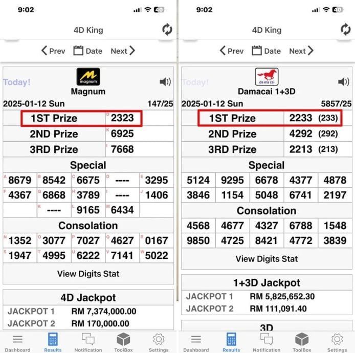 万能于週日开采日开出的头奖号码为“2323”,而大马彩在同一天开采的头奖号码则是“2233”。