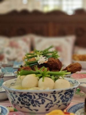 吃过团圆饭,再煮一锅饭,盛在几个碗里摆在神桌、祖先台、灶君台。“我们叫做‘Nasi Sambut Tahun’,其实就是福建人的‘春饭’。”马六甲的峇峇娘惹会在春饭上插一株仙丹花和青葱,分别象征众多和取义聪明。