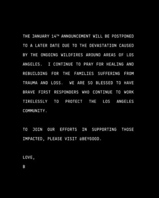 贝文丝是本届格林美音乐奖的入围大赢家,她一共获得11项提名,但现在因为洛杉矶野火让她实在开心不起来,她说:“我继续为遭受创伤和损失的家庭祈祷康复和重建。我们非常幸运能够拥有勇敢的急救人员,他们继续不懈地努力保护洛杉矶社区。”她捐出250万美元用于救灾行动,网民纷纷大赞她的善举,认为她是最美天使、捐钱帮助需要的人。