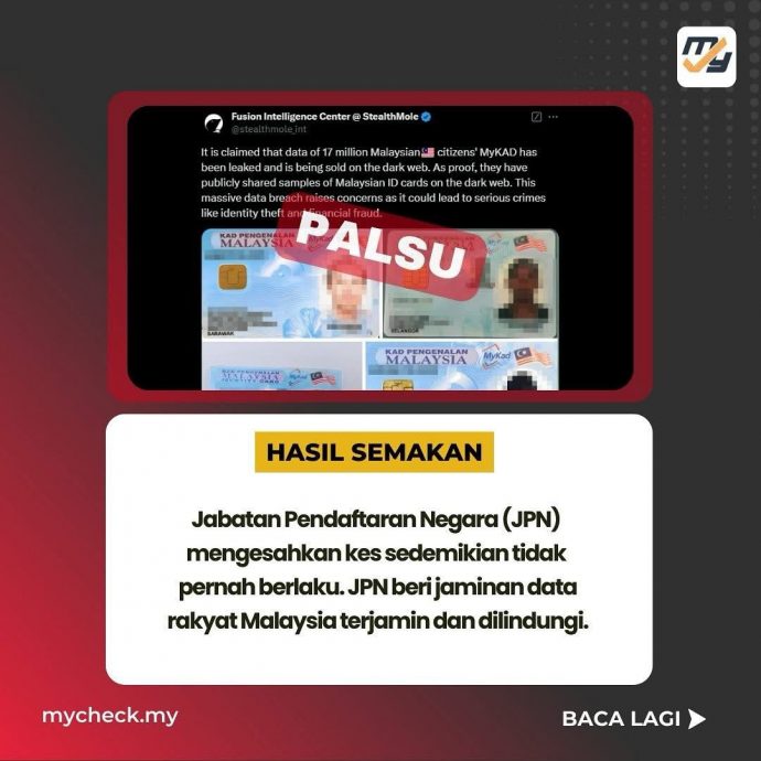 (八打灵再也17日讯)有不法分子在暗网出售1700万名大马人的大马卡资料?根本没这回事!