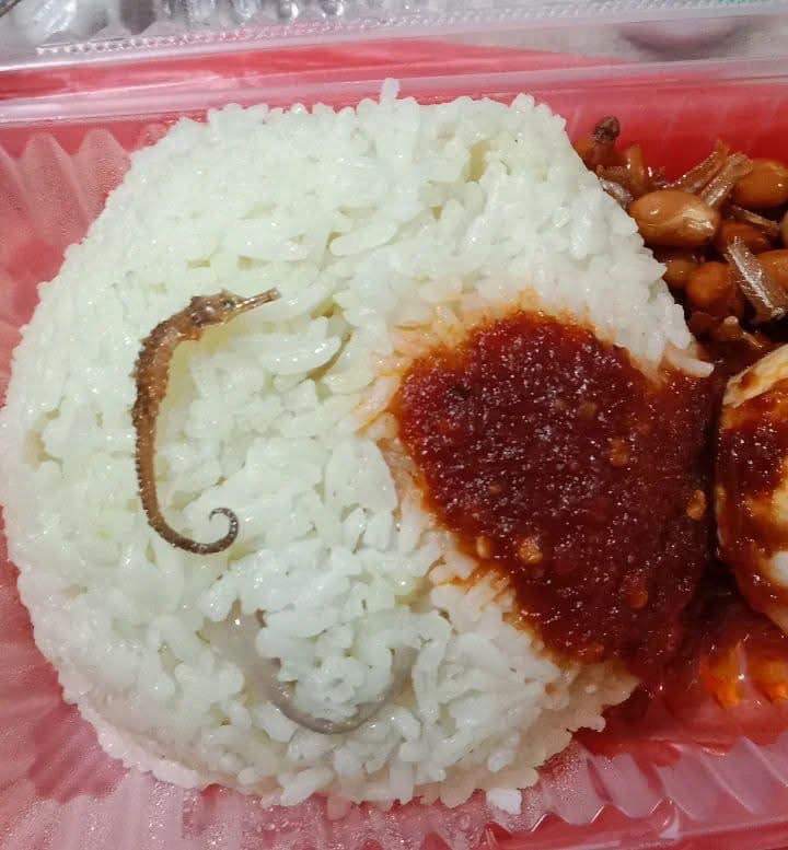 一名网名昂库尔在其脸书上发文,指他购买的椰浆饭里除了有平时吃的炸江鱼仔,还出现炸海马,让他吓了一跳。