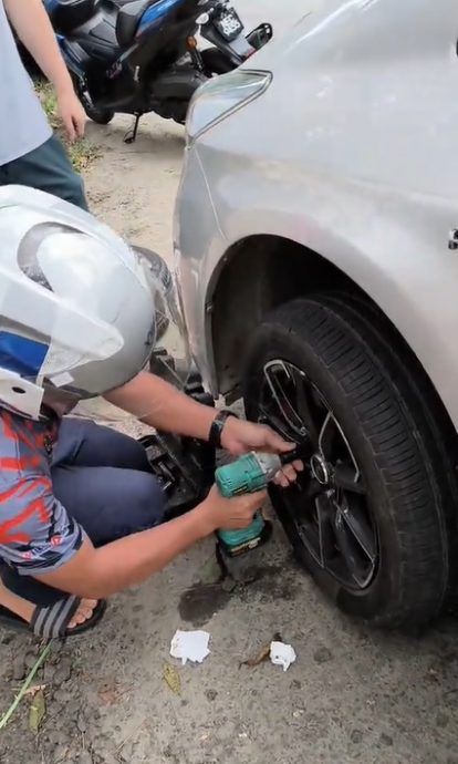 鲁海查与一名摩托车的友人看到有人求助,都二话不说停下帮忙;友人还拿出电动扳手,尝试帮这班游客解决问题,甚至不惜返回家一趟拿其他的工具,却依旧无法拧开螺丝。