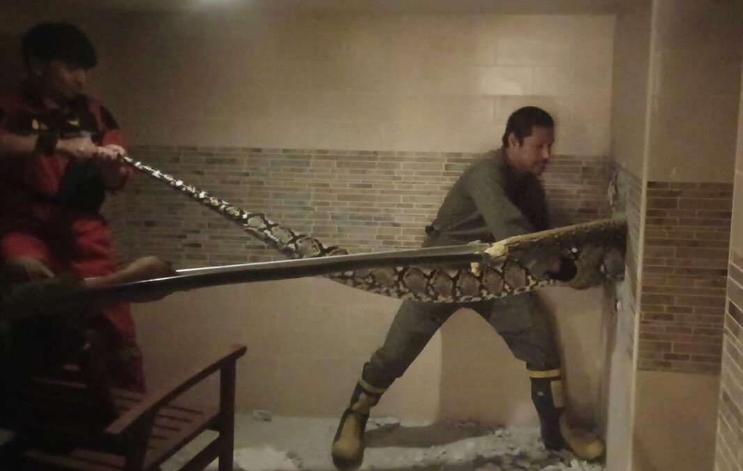 (芭堤雅24日综合电)公寓惊见大蟒蛇吓坏清洁工人,消防员赶到后,发现蟒蛇已经藏到游泳池底下的卫浴间,费了一翻功夫将墙面击碎钻开大洞才将蟒蛇拉出来。