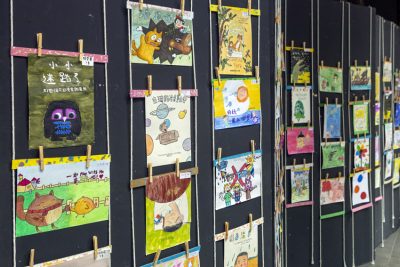 从构思到勘查,剪贴到悬挂,接待到导览,策展团队从头到尾一手包办。他们并非专业策展人,却凭着满腔热情,硬是将体验展做到了极致,为参访者带来了一场难忘的绘本艺术之旅。另外,主办方还筹办了小小画展,鼓励小朋友模仿自己喜欢的绘本,绘制封面,参加展出。没想到,看似点缀周边的小小画展,却意外收到极大回响,许多参展作品都出乎意料的精致好看。那面展出的画墙,成了经典绘本的广告牌,特别吸睛。