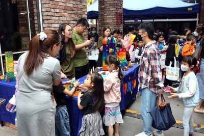 除了为孩子讲故事、策展览、荐读好书,“故事万花筒”还特意打造了一个供孩子自由发挥的平台——小鬼当家市集。在这里,小孩当起了大老板,家长变成了小助手,亲子合力开档做生意。各类档口,有的出售自制饮料和小吃,有的贩卖二手童书和玩具,有的提供史莱姆游玩体验。从策划到营销,小朋友自己做主、亲力亲为,实际体验小小企业家的滋味。