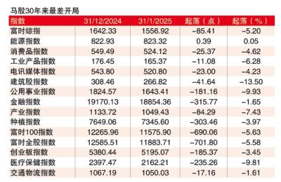 面对外资持续撤离,富时综指在2025年伊始便接连失守1625点、1600点及1580点等多个关键支撑位,最低一度跌至1555.54点。尽管随后受逢低买盘支撑,指数短暂回升至1587.80点,但随后又爆出美国进一步收紧人工智能晶片和技术出口限制,以及中国AI黑马DeepSeek半路杀出,令数据中心和AI概念股应声大跌,马股涨势未能延续,随后再度转跌,并最终以1556.92点收官1月交易,单月重挫85.41点或5.20%。