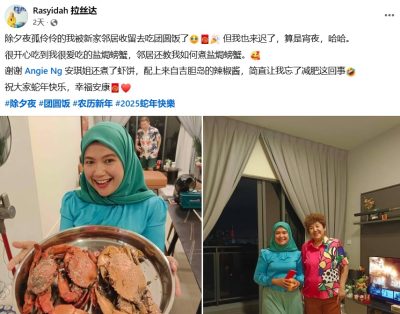 (八打灵再也31日讯)RTM电视台华语新闻主持人拉丝达除夕夜到邻居家迎新年“又吃又拿”,大啖盐焗螃蟹和虾饼让她直呼“忘了减肥这回事”,她手拿红包还被网民“催婚”!