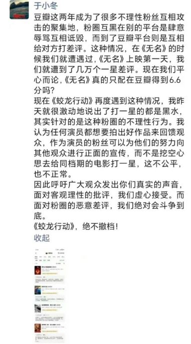 于冬称他们虚心接受客观理性的批评,而面对粉圈的恶意差评,“我们绝对会斗争到底。”同时也强调《蛟龙行动》绝不撤档。相关发文一出,迅速登上微博热搜,网民纷纷吐槽:“真的不好看啊,还不让说”、“只有3000个一星就在卖惨”、“怎么不直接点名是谁恶意打一星”、“这是仆街了,开始发疯吗?”