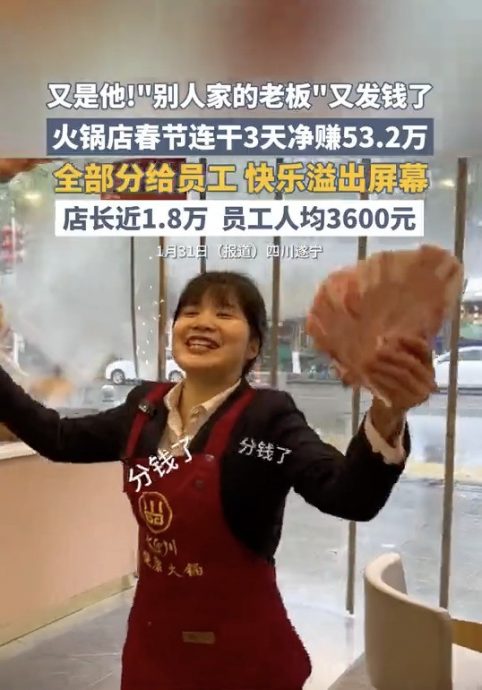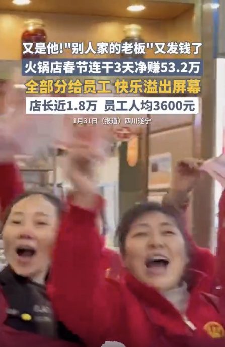 中国四川遂宁七里川一家火锅店让网民羡慕不已,雇主把除夕到初二这3天净赚的53万2000人民币(下同·约32万2748令吉)全发给员工,引起全网关注和热议。