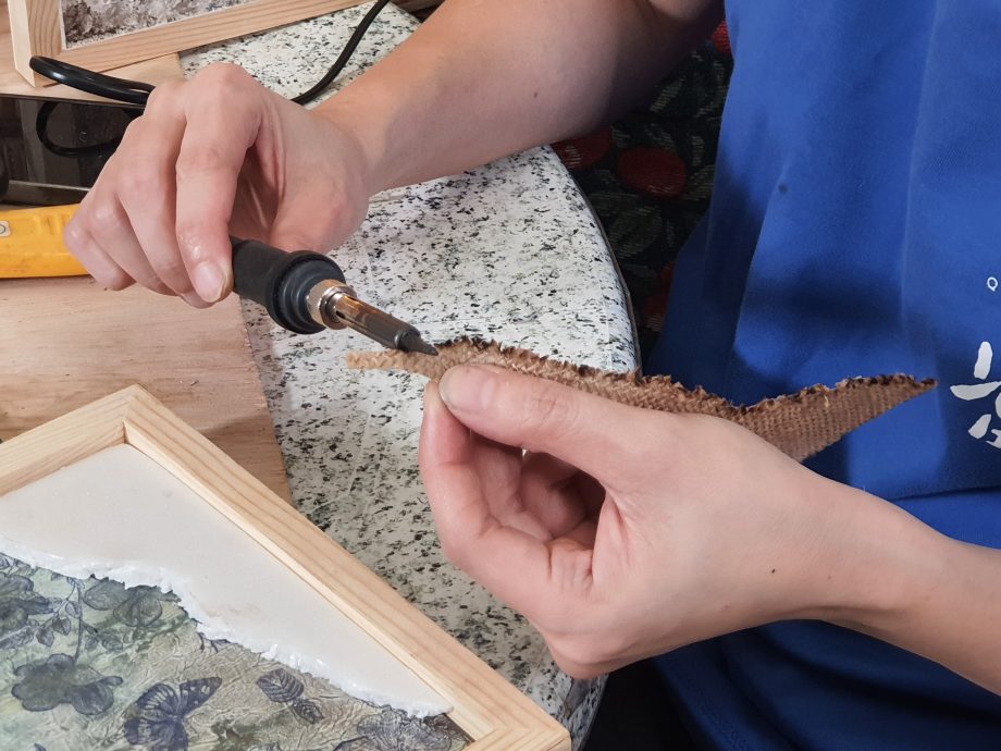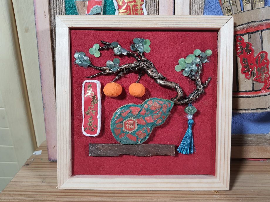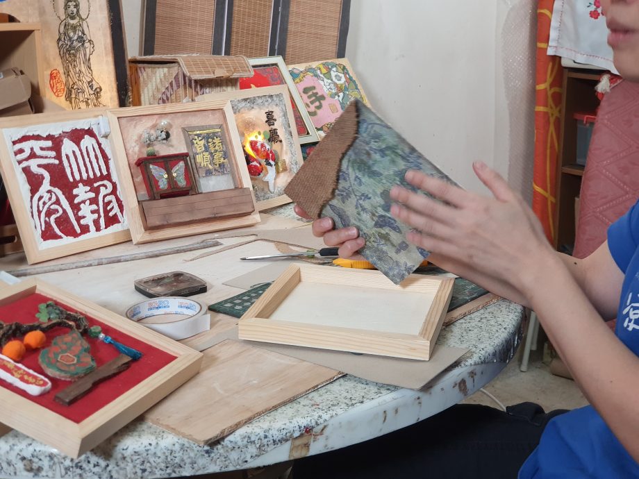 陆玟静制作新春手作的方法相似。她会先选用一个平面的木框(20×20 cm),而剩余的材料近一半是来自日常生活中的废弃物,如泡沫板、纸皮、外卖盒、奶茶杯等。在她的慧眼下,这些看似无用的废品竟能组合成令人惊艳的艺术品。她需要的,是发现美。因为美已经在生活中随处可见,或许我们只需将它组合起来。变废为宝,是她的核心概念之一,她也十分提倡环保概念。然而,手作没办法完全依赖废物,仍然需要一部分辅助材料才能完成。比如,她选用的木框,就不容易在废品里找到合适的原材料。