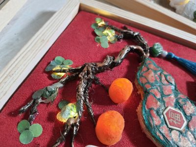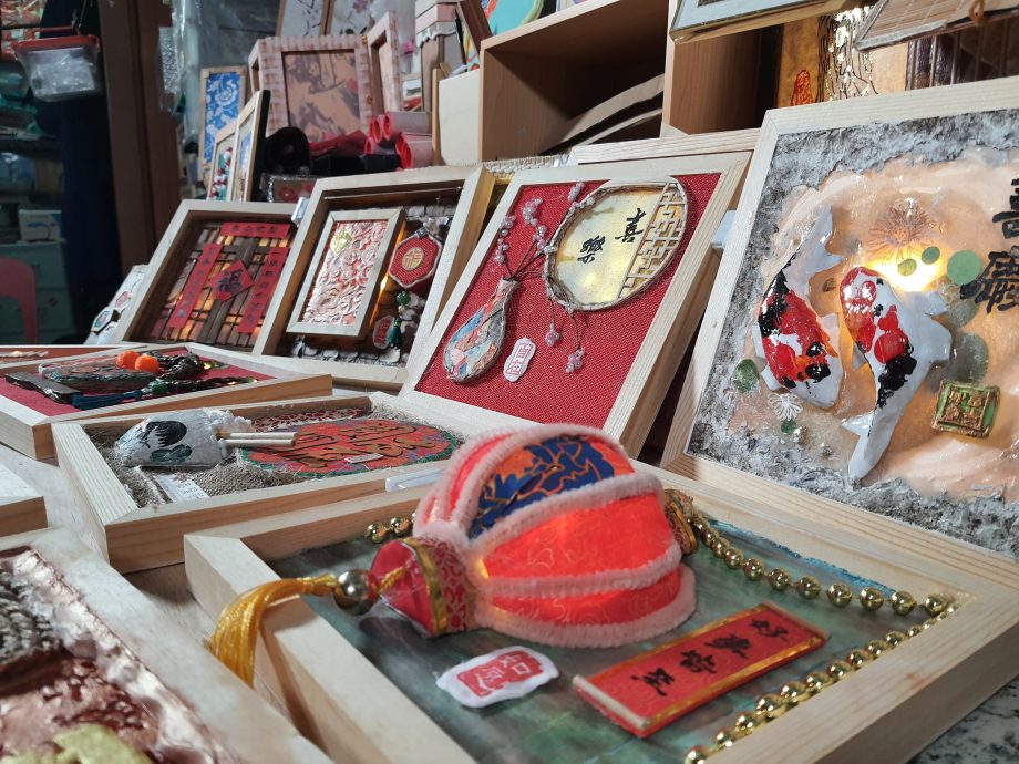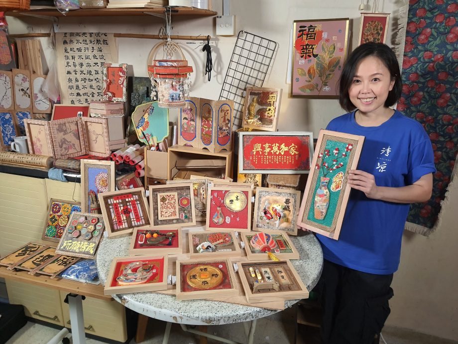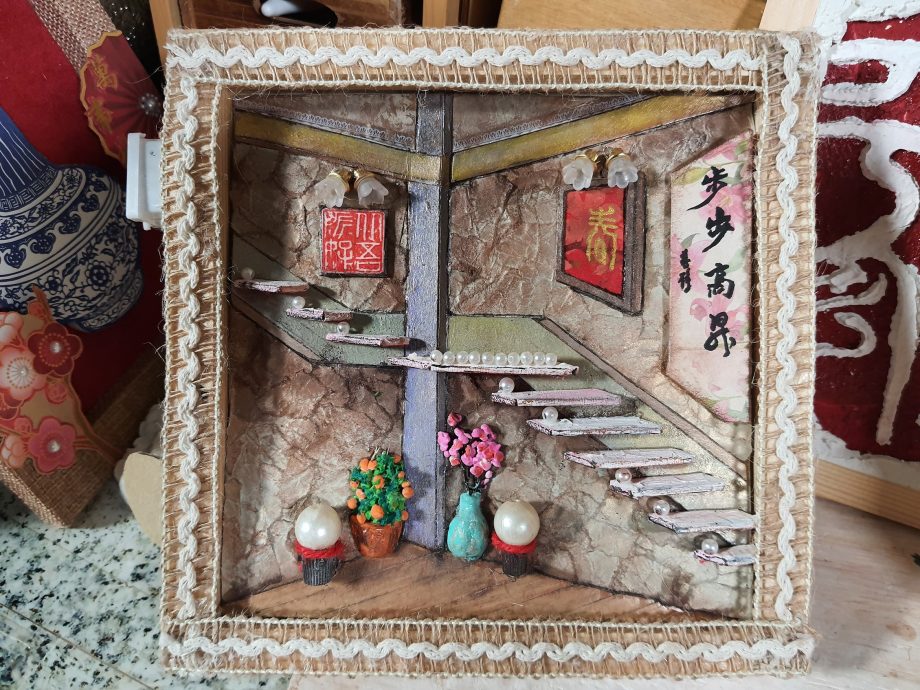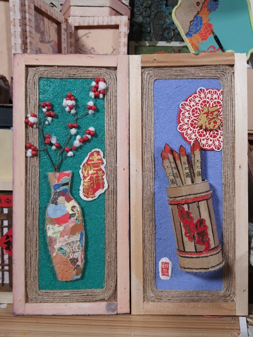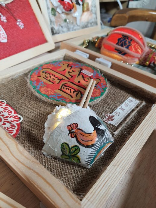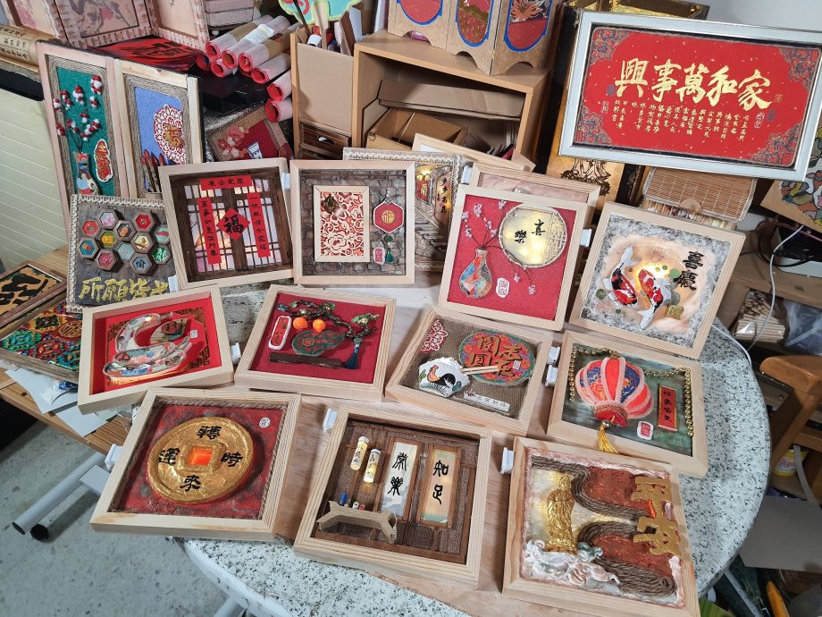 今年,她的手作主打以微缩模型(miniatures art)来呈现,结合时下流行的LED灯泡,让作品能够成为发光的画框模型。光亮的加入,能更好地带出节日的喜庆和愉悦感。观察她作品的人会发现,她的作品经常搭配书法。“我本身是个书法人。所以我的作品多数与书法结合。这也是目前流行的书法文创。”