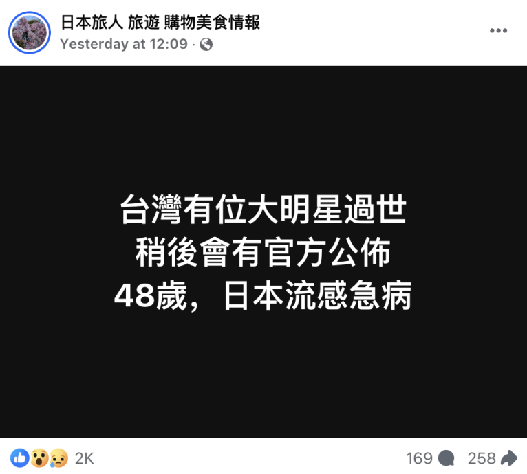 该粉专于星期天(2日)中午发文,称“台湾有位大明星过世,稍后会有官方公布,48岁,日本流感急病”,引发外界揣测与热议。