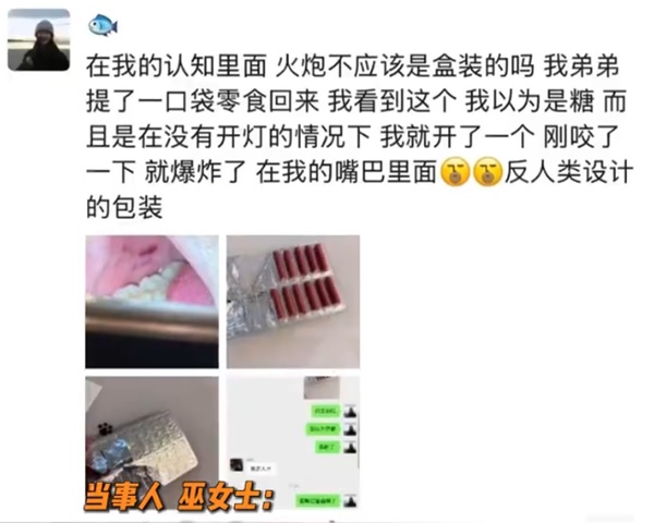 离奇的事件引发讨论后,不少大陆网友认为,“应该标明危险物品”、“真的很像糖果”、“这个包装太容易混淆了”、“确实很容易误导人”、“我靠,给我我也会当奶糖吃啊”、“现在鞭炮的外包装都这么精致了吗?”