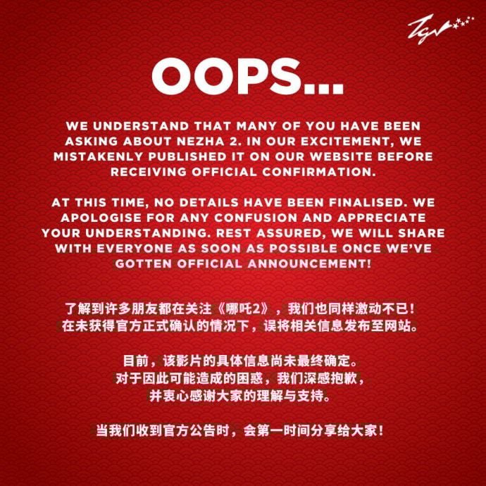 《哪吒2》上映急喊停!TGV道歉澄清:未获官方确定