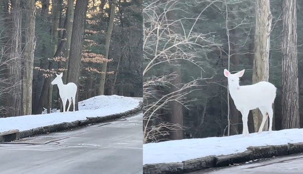 女网友@carolynnrs近日将视频分享到TikTok上,画面中一只全身洁白的白鹿站在路边,看起来如梦似幻,女子忍不住放慢车速,拿起手机记录下眼前这一幕。