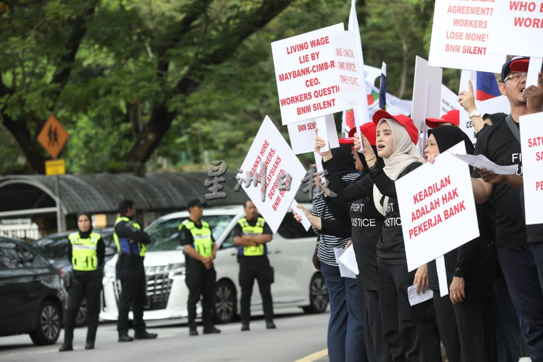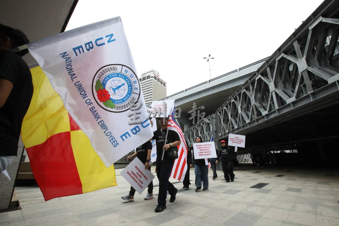 来自全国各银行约300名职工会会员,今早8时开始在独立广场集合,随后游行到国家银行大厦,在门前高举大字报表达心中不满;主席者还包括该职工会主席陈荣煌。
