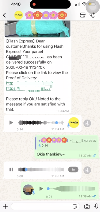 据顾客分享的对话记录显示,这位送货大哥在送达包裹后,主动在WhatsApp上发送信息确认,并附上“谢谢”。
