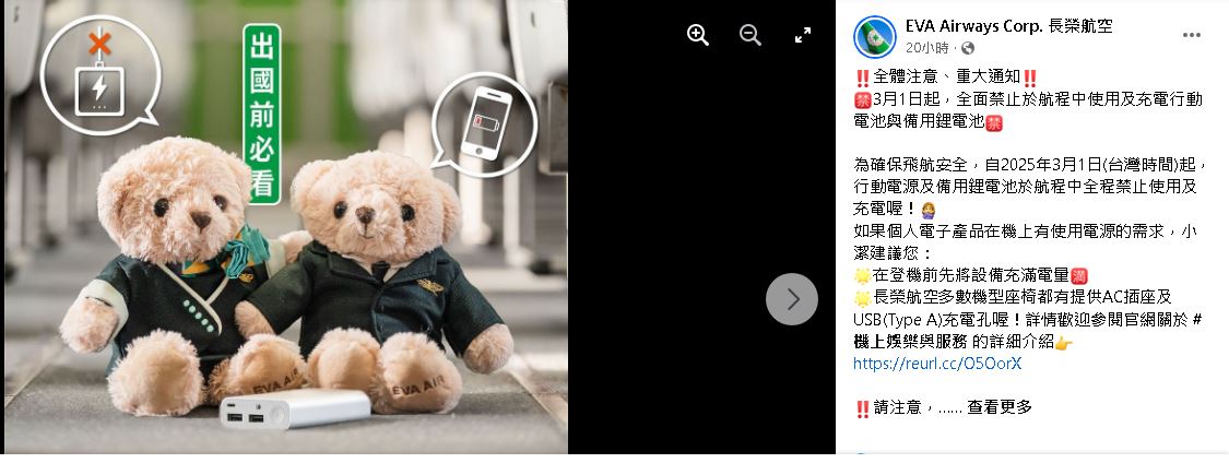 (台北26日综合电)长荣航空于脸书官网公布,3月起禁止在机上使用行动电源或备用锂电池。