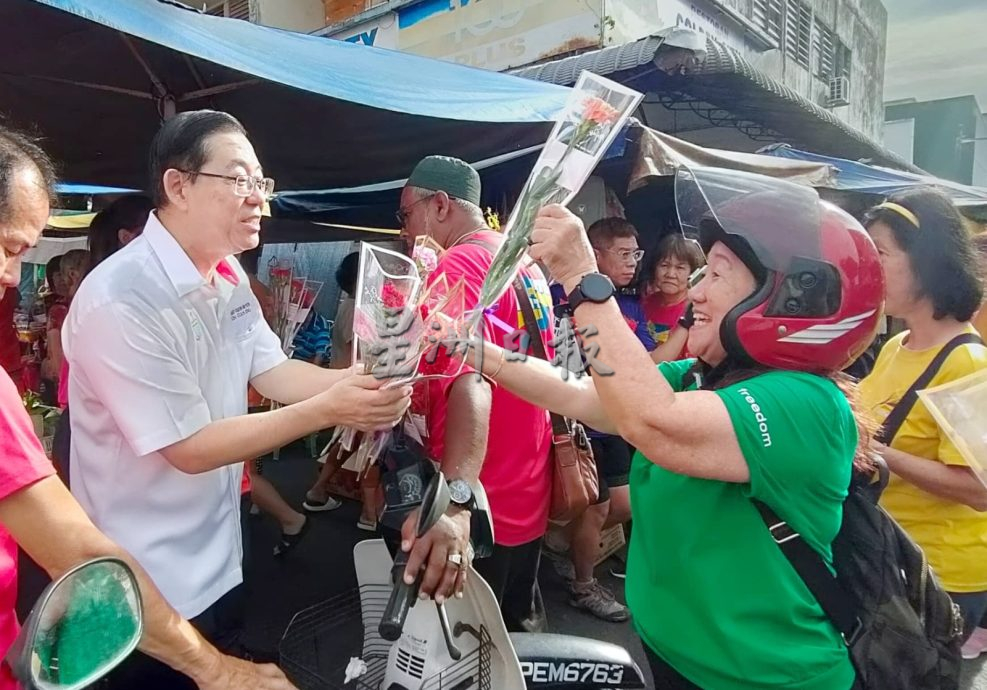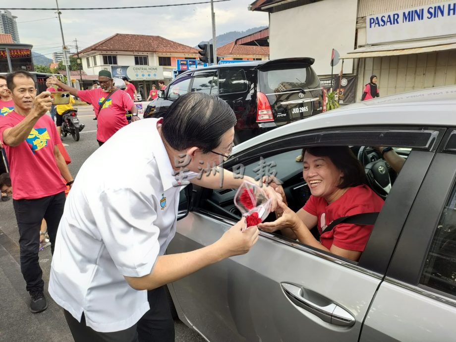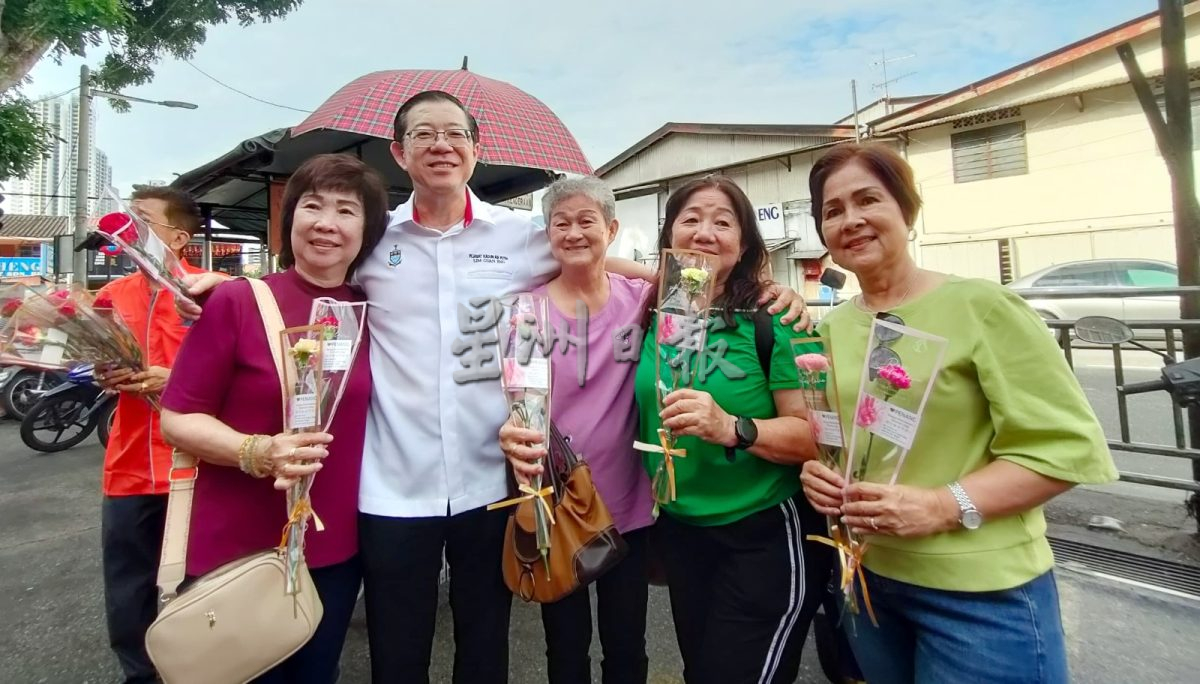 (槟城8日讯)行动党主席兼阿逸布爹州议员林冠英今日趁着妇女节送花,受到民众热烈欢迎,女的心花怒放,男的还祝他当选!