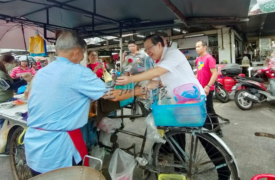 他今早上在阿逸布爹一带的咖啡店和巴刹派发康乃馨时,有紧贴时事的民众在收花后,祝他能在党选中顺利当选。