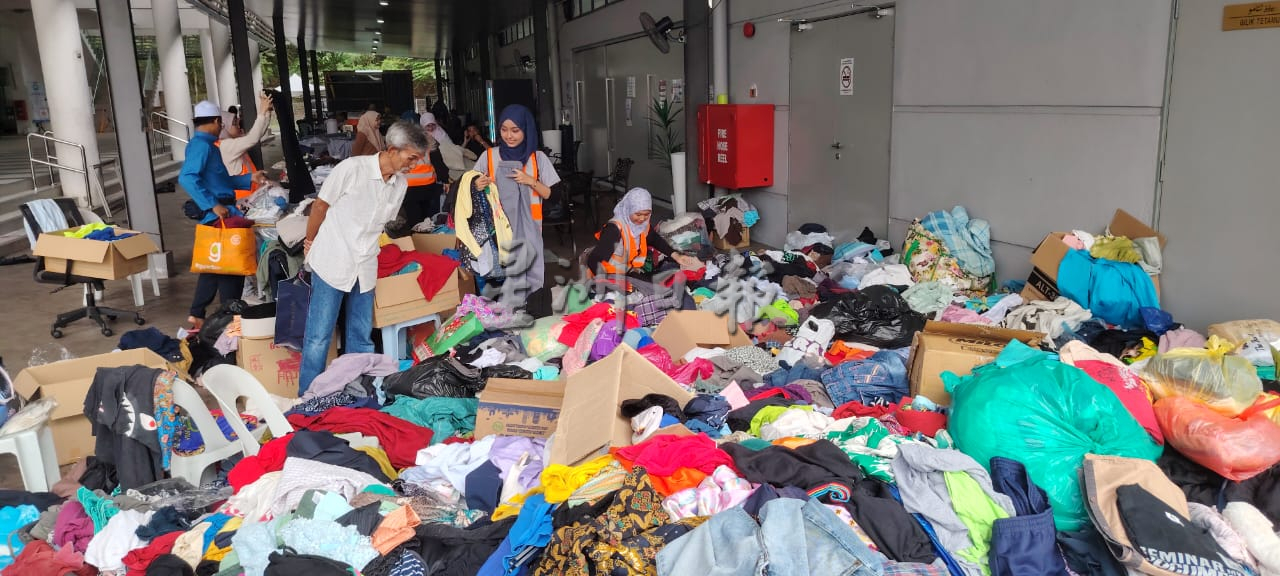 此外,中心侧边堆放大量捐赠衣物,供灾黎挑选。