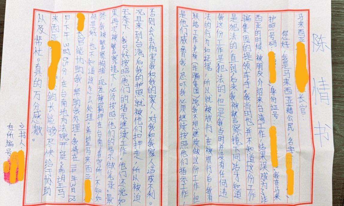 大马籍“车手”亲笔书写的陈情书。(李政贤供图)