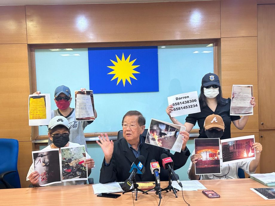 男子母亲曾女士(63岁)在马华公共服务及投诉部主任拿督斯里张天赐陪同下召开新闻发布会,揭露勒索集团无法无天的猖狂行为,让他们一家身心备受煎熬,日日担心住家被烧毁,无法安眠入睡。