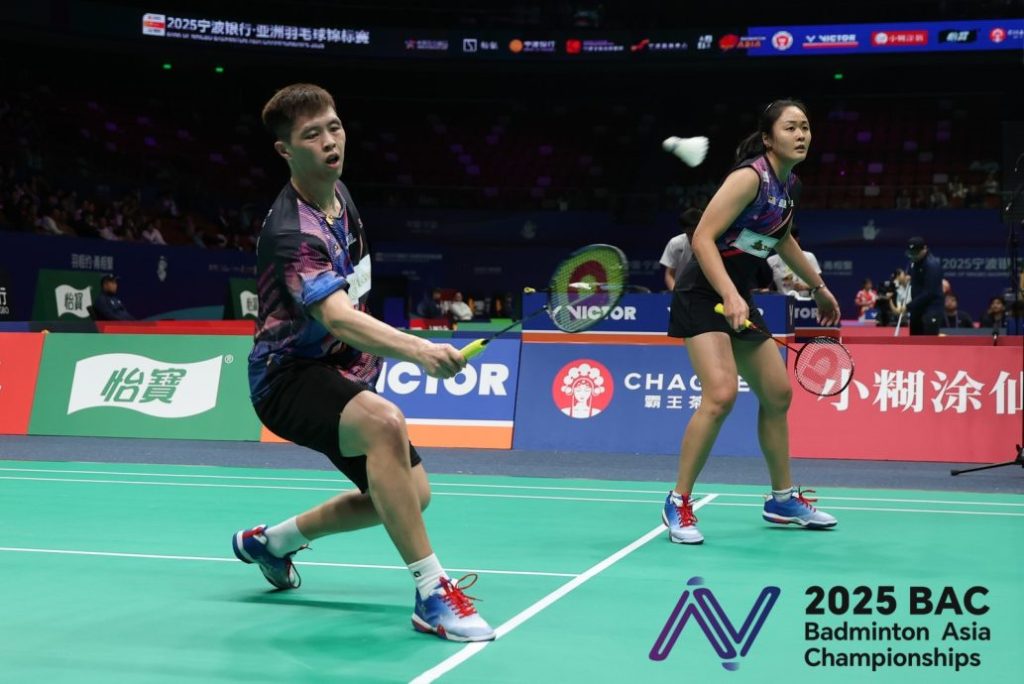 “天仙组合”黄天啟与林秋仙首圈直落两局不敌日本组合霜上雄一与保原彩夏,无缘晋级。(2025亚洲羽球赛组委会照片)