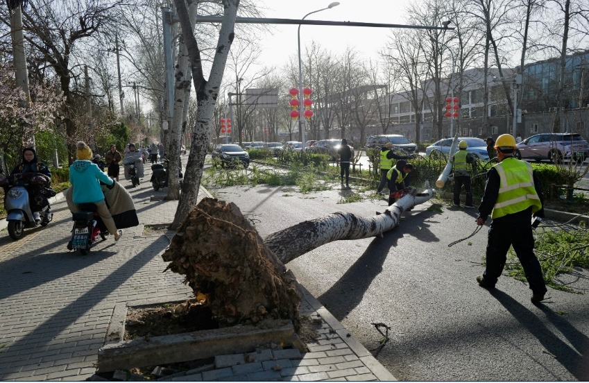 图为今年3月25日,北京海淀区西三旗街道,一棵大树被大风吹倒。(图:中国日报)