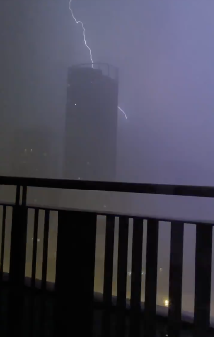 有居民拍下窗外画面,可见多道闪电划破夜空,伴随震耳欲聋的雷声,场面犹如爆炸,令不少人从熟睡中惊醒。