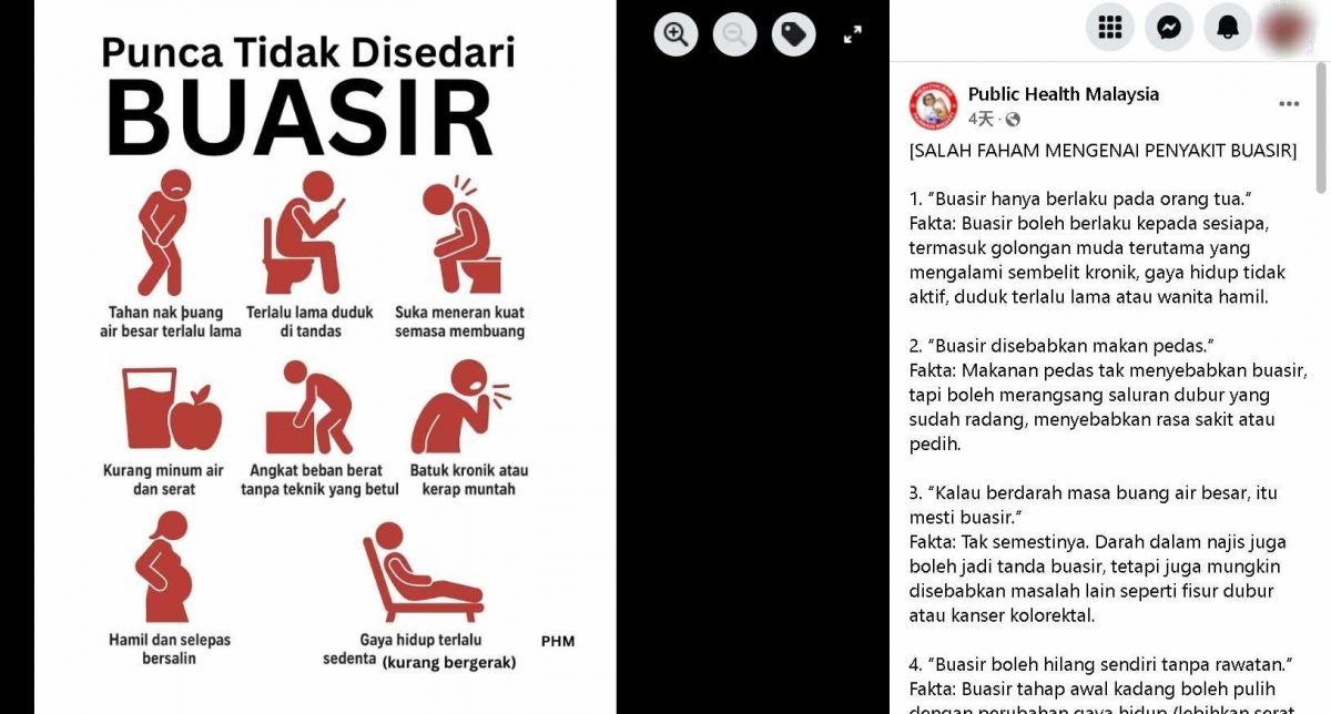 大马公共卫生组织日前在脸书专页列出10个人们对痔疮的常见误解。贴文提及,许多人因为害羞,不敢谈论痔疮,更别说看医生了。正因为存在太多误解,导致很多人延误治疗。