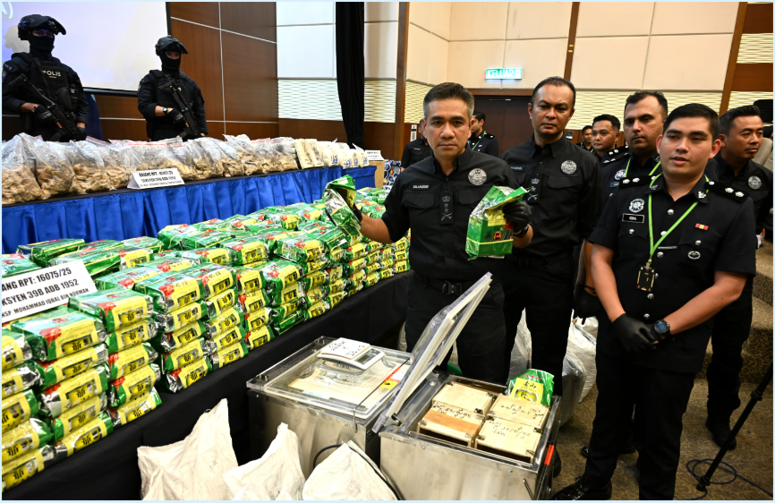 他说,除了起获毒品外,警方也扣了4辆轿车,连同毒品在内,警方共扣押了总值8224万令吉的财物,是今年内,警方侦破最大宗的跨国贩毒案。