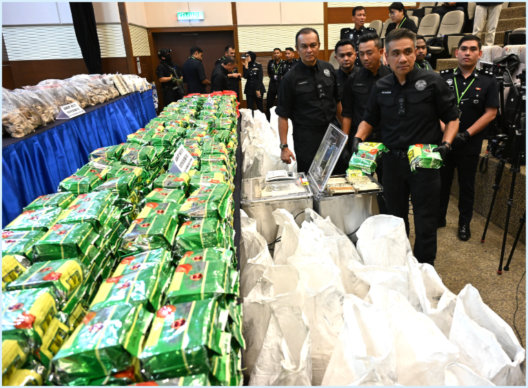他指出,警方在行动中共起获833包伪装成茶叶的冰毒、95包K他命、81包摇头丸、56包装在麻袋的冰毒及一盆装有冰毒的塑料盆,所有起获的毒品总重为冰毒1986公斤、97公斤K他命及82公斤摇头丸,起获的各类毒品约2吨(总值约8214万令吉)。