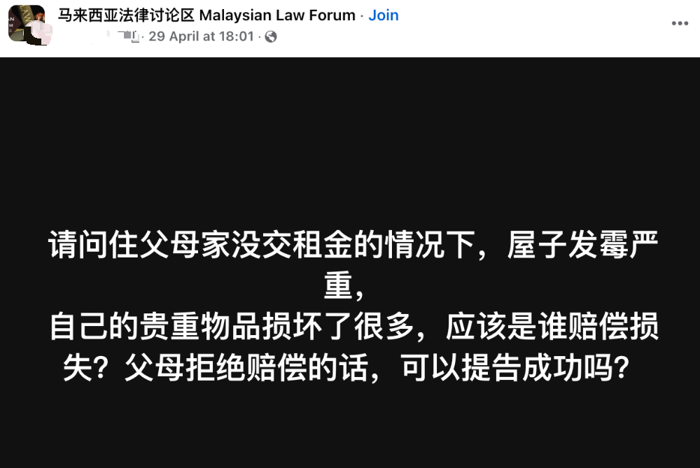 一名女子近日在脸书群组“马来西亚法律讨论区”发文表示,自己长期住在父母家中,并未缴交租金。
