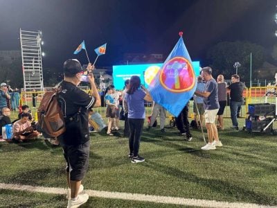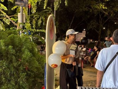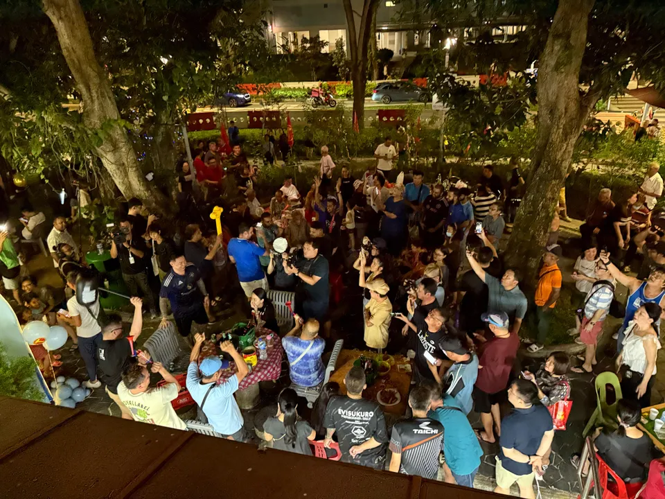 投票截止前15分钟,许多工人党支持者聚集在后港第322座组屋“燕飞来”咖啡店以及临近的小公园。他们当中有人拿着“铁锤”造型的空气填充物在咖啡店吃饭。铁锤是工人党的标志。