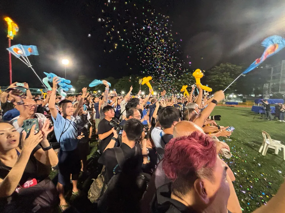 支持者看到工人党在盛港集选区在抽样计票暂时领先时,拉炮欢呼。(图:8视界)