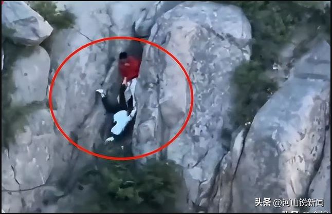 千钧一发之际,红衣男子单手抓住崖边绳索,另一只手死死攥住女子脚踝,以头朝下的姿势悬在峭壁之上,巨大的冲击力让他们卡在狭窄山缝中。(互联网照片)