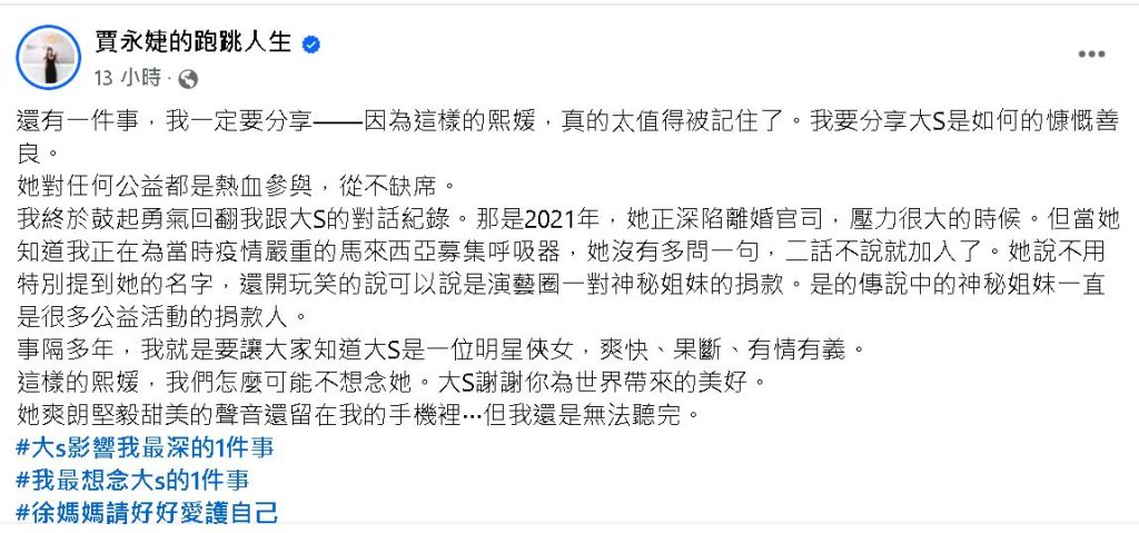 贾永婕10日深夜发文分享大S生前的一事,指她对于公益活动都是热血参与,2021年在疫情期间,大S正深陷离婚官司,压力很大,但当得知贾永婕在为当时疫情严重的马来西亚募集呼吸器,立刻二话不说捐款100万。