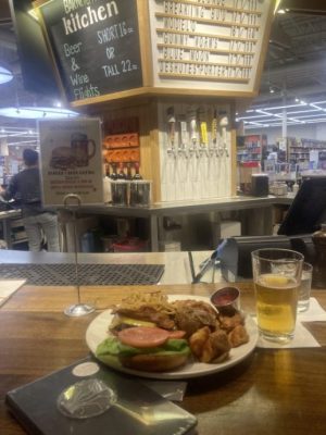 在美国出差结束前,我在同一个小城Folsom,再次去了一家位于新商区的Barnes & Noble。吸引我去的原因是看到网络地图展示的书店前喷水池的照片。到了之后,更让我惊喜的是里头除了有卖咖啡,竟然还有售卖汉堡和啤酒的吧台,有人一面看着书一面喝着啤酒。看书,有了一种更加悠哉的姿态。“反正年轻人不太买书了,那就让中年大叔到我的店来消费吧。”——我似乎听到了店长的心声。