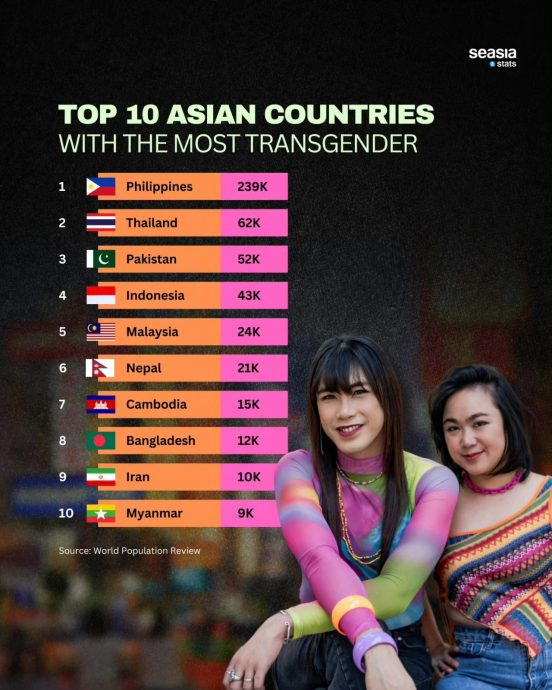 根据“@seasia.stats”在脸书发布的新数据,马来西亚共有2万4000名跨性别人士,在亚洲国家中排在第五位。