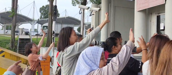 粉丝们来到关卡前,目光锁定兴兴和靓靓所在的车子,尽管看不见两只大熊猫,众人依然隔着围栏拍摄,并挥手道别,不舍之情溢于言表。