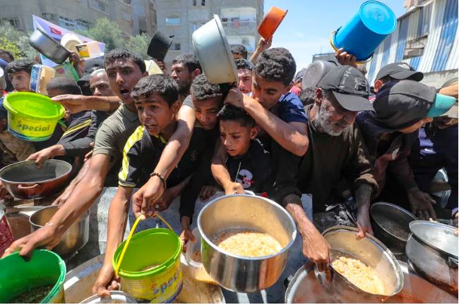 因以色列封鎖而饱受饥饿之苦的巴勒斯坦人领取热餐。(法新社照片)