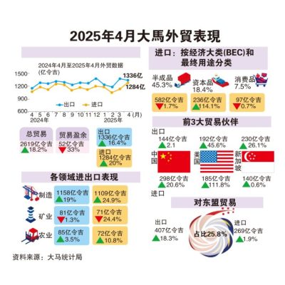投贸部指出,大马对主要贸易伙伴,即对东盟(占25.8%)、中国(占16.9%)、美国(占14.4%)和欧盟(占6.8%)的出口均创下历史新高。