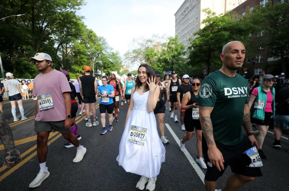 28岁的特里格勒斯在婚纱背后贴上写有“Just hopeful(盼婚)”的纸张,呼应婚礼车后的“Just married(新婚)”传统,吸引许多参加者要求合影。她透露,自己两年前已开始穿婚纱跑步,曾为追赶曼哈顿的裸男跑者而穿婚纱冲上高速公路,虽未找到约会对象,却成功逗乐不少人。